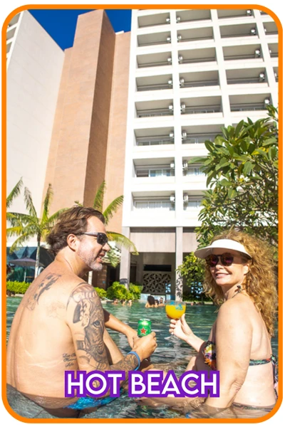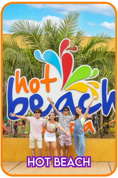 O Hot Beach é conhecido por seu ambiente relaxante e atrações aquáticas, oferecendo uma experiência mais tranquila e sofisticada, com amplos espaços para descanso.
