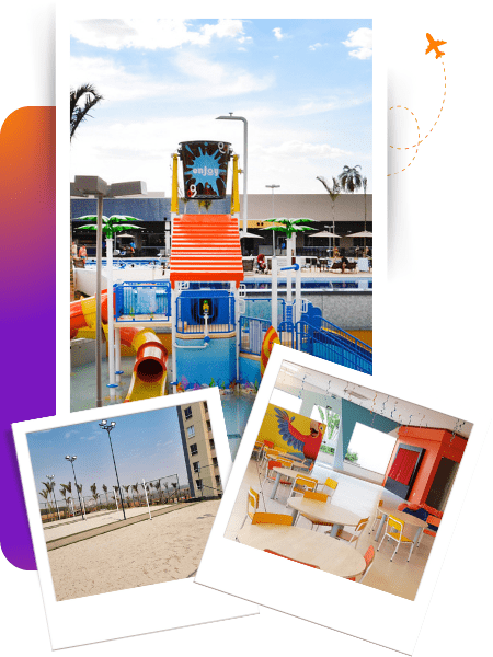 - Para crianças: parquinho aquático, parquinho seco, brinquedoteca e programação temática com monitores.